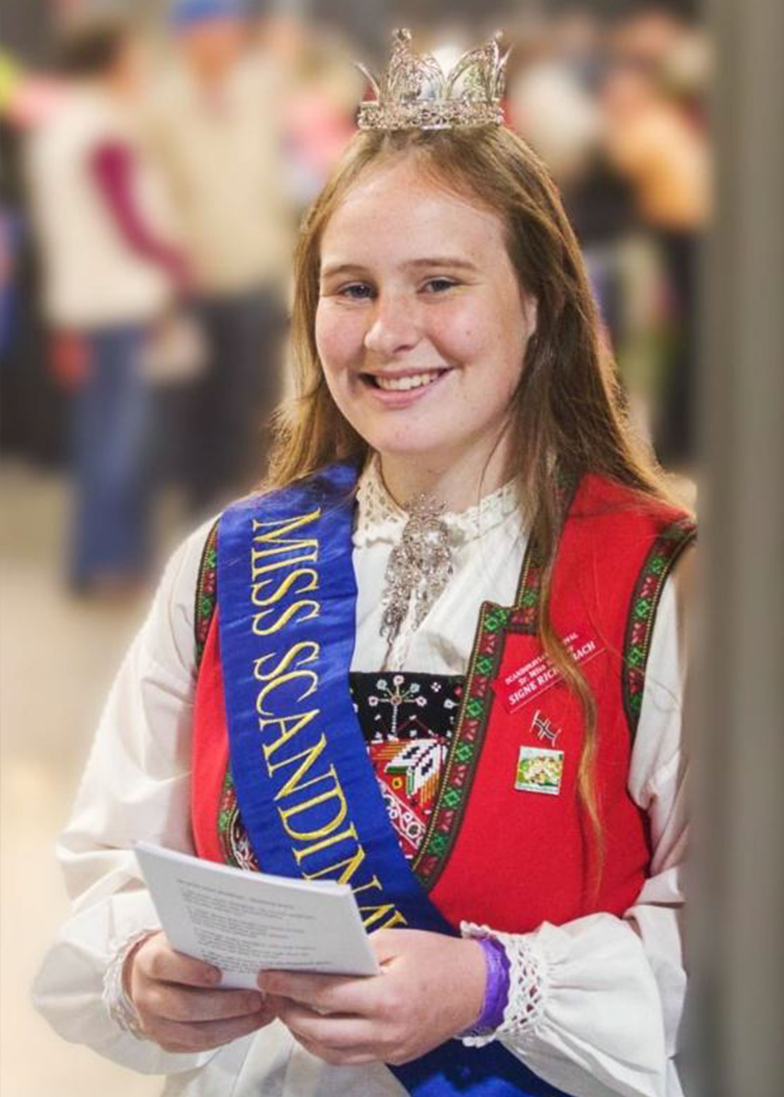 Signe Rickenbach was crowned Miss Scandinavia at the 2025 Astoria Scandinavian Midsummer Festival and will reign until a new queen is chosen on June 19, 2026. Signe is a former Miss Norway and danced with the Viking Nordic Scandia Dancers for five years. Her Norwegian heritage comes from both her mom and dad. Signe is attending Clatsop Community College and Oregon State University, studying Construction Engineering Management. She enjoys riding horses and dirt bikes.